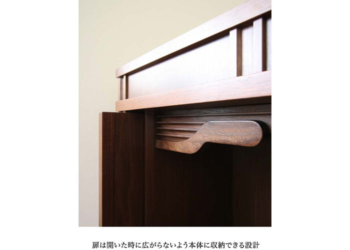![]() 宗派に関わらずどなたでもお使いいただける、納骨仏壇です。格天井は三段に組んだ 重厚な作り込みで、LED照明が内蔵。上からの柔らかな明かりが位牌を照らします。 扉は開いた時には本体に収納できます。細部までていねいに製作しました。 |