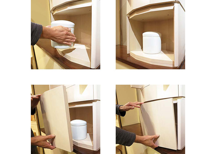 祭壇の内部に小さな骨壺を入れることができます。 扉は、開いた際に広がらず、八角形の本体にそって滑らかに内部に収納されます。 閉じたときにはマグネットですっきりと止まり、開いてしまうこともありません。 LED照明内蔵。環境にやさしく、また火を使わないので安全です。 |